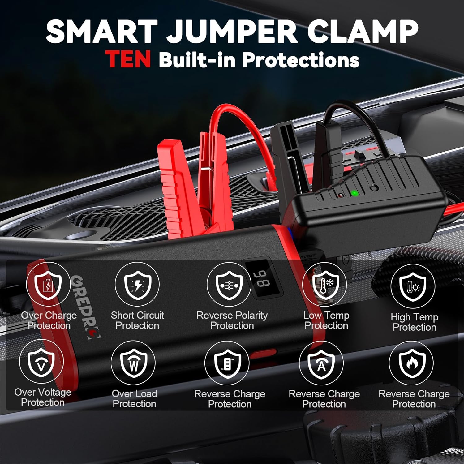 • 【Powerful Car Jump Starter】GREPRO portable jump starter is able to jump start most kinds of 12V vehicles (up to 6.0L Petrol / 3.0L Diesel) up to more times in a full-charge, works for passenger cars, motorcycle,lawn mower, trailer, snowmobiles etc. Every driver must to have a car battery jump starter in case of emergency situation